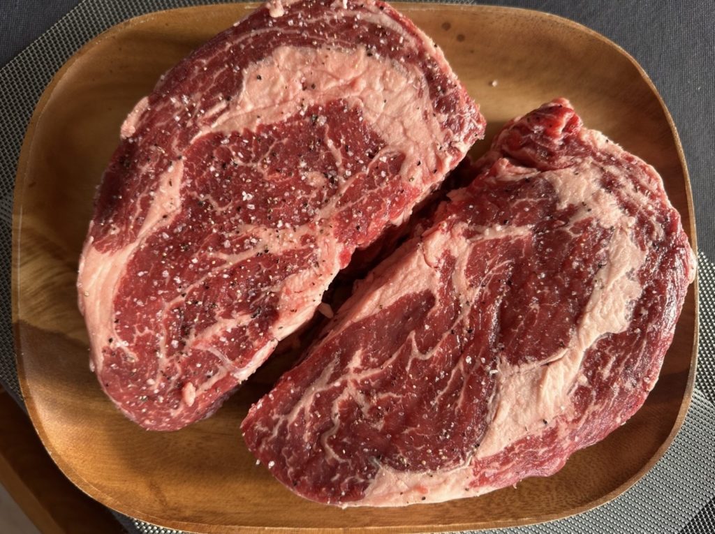リブアイ(Ribeye)は、牛のリブロースから骨や余分な脂を取り除いた中心部の部位で、赤身と脂身のバランスが良く、柔らかさと濃厚な旨味が特徴の高級部位です。150日以上のグレインフェッドMB2+、世界で最も安全な牛を使用。 ハラール認証。